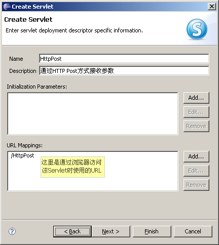 出現Servlet映射的配置界面,輸入適當的Description。注意下方的 URL Mappings,這個就是從瀏覽器訪問該Servlet時使用的URL。
