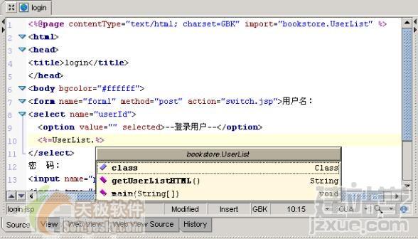 通過表達式標簽替換原靜態(tài)的HTML代碼,值得提起的是,在JSP中也可以象在編寫一般的Java類中一樣使用CodeInsight輸入代碼。調(diào)整后的login.jsp的代碼如下所示,用粗體表示: