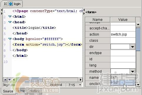 屬性編輯器是動態(tài)的,光標移到不同的標簽上,屬性編輯器就顯示這個標簽所有可設置的屬性。如上圖中對應的是HTML 表單標簽的屬性編輯器,我們將其action屬性設置為switch.jsp,指定用POST方式發(fā)送請求數(shù)據(jù)。