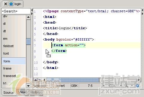 按鈕控制的豎欄,左邊欄為放置JSP標簽和HTML標簽的面板,可以像可視化UI設計器中一樣用拖拽方式往JSP文件中放置各種標簽,如上圖中,我們從面板中選擇表單的HTML標簽放置到login.jsp文件中。