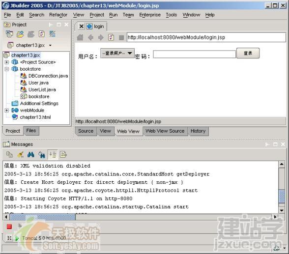 保存login.jsp后,在內(nèi)容窗格login.jsp文件標簽中點擊右鍵,選擇Web Run using Defaults,JBuilder 將啟動Tomcat 5.0應用服務器,運行于8080端口上,編譯并運行l(wèi)ogin.jsp文件,如下圖所示: