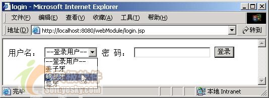 我們在login.jsp中提供一個用戶名下拉框、一個密碼輸入框以及一個登錄提交按鈕,其代碼如下: