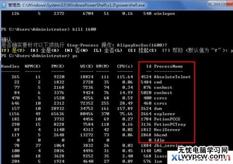4.列出的所有進程是按最后一個字段ProcessName 來排序的,這個不是重點,我們重要要看的是ID這一欄,這一欄就是進程ID,是獨立無二的,每個進程運行后,系統都會自動分配一個進程號,我們結束進程,也需要利用這個進程號