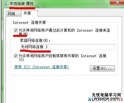 右擊“本地連接”(也就是你連入網(wǎng)絡(luò)的寬帶網(wǎng)卡),然后點(diǎn)擊屬性->共享,勾選“允許其他網(wǎng)絡(luò)用戶通過(guò)此計(jì)算機(jī)的Internet連接還連接”選項(xiàng),在下拉菜單中選擇剛才建立的虛擬網(wǎng)絡(luò):無(wú)線網(wǎng)絡(luò)連接 3。