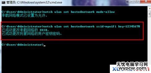 然后繼續(xù)輸入:netsh wlan set hostednetwork ssid=您想要的無(wú)線網(wǎng)絡(luò)的名稱 key=您想要設(shè)置的密碼,注意:“您想要的無(wú)線網(wǎng)絡(luò)的名稱”和后面的“key”之間有空格,請(qǐng)參考圖中樣式) 這一步是設(shè)置wifi名稱和密碼,而且密碼必須8位以上。