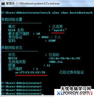 在開(kāi)啟wifi的過(guò)程中,你還可以在命令提示符輸入命令:netsh wlan show hostednetwork,來(lái)查看建立的無(wú)線網(wǎng)絡(luò)信息,最重要的是還可以看到已連接用戶的客戶端數(shù)目和mac地址。這樣你就可以知道自己的wifi有沒(méi)有被蹭網(wǎng)了。