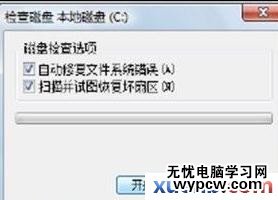 第3步:在彈出的“檢查磁盤”對話框中勾選“自動修復文件系統錯誤”和“掃描并試圖恢復壞扇區”復選框,然后單擊“開始”按鈕。