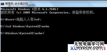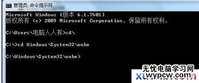 3再輸入:cd windows/System32/oobe 按回車(Enter鍵)定位到oobe文件夾。