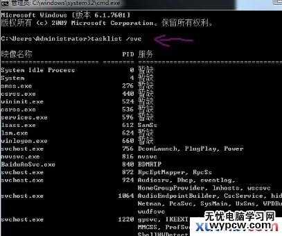 在cmd命令行下輸入tasklist/svc 就可以看到計算機當前正在運行程序了。如下圖2: