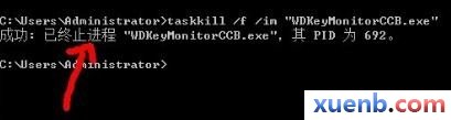 比如關(guān)閉當前不用的WDKeyMonitorCCB.exe程序,可以在dos命令行中輸入