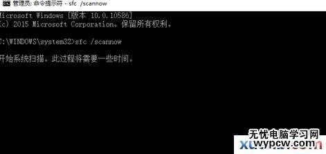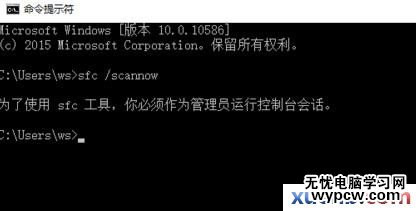輸入sfc /scannow,該命令必須以管理員身份執行,否則運行會報錯,如下圖報錯提示