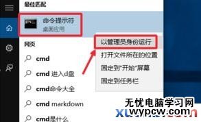 然后搜索結果中,還是在命令提示符上單擊右鍵,選擇管理員身份運行。