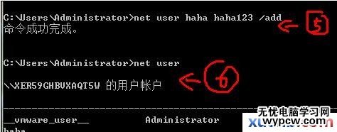 (6)下面我們說說如何新建一個用戶。在cmd中輸入 n,回車,就會創(chuàng)建用戶名為haha,密碼為haha123的用戶。如下圖所示。
