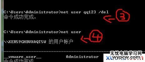 (5)使用net user可以看出qq123用戶已經(jīng)被刪除了。如上圖中4所示