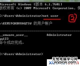(3)在命令行中輸?a target="_blank" class="infotextkey">.net user ,回車,會顯示出當(dāng)前計算機(jī)的用戶。如下圖中包括虛擬機(jī)的賬戶、系統(tǒng)默認(rèn)的管理員中戶administrator、訪客賬戶guest、及新建的用戶QQ123