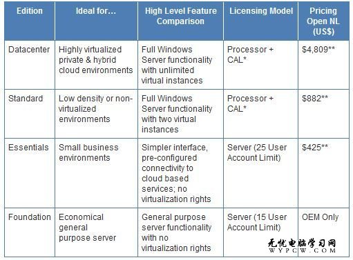 另外,Windows Server 2012的Datacenter版售價4809美元,Standard版882美元,Essentials版425美元(限制25位用戶) ,Foundation版僅提供給OEM廠商(限制15位用戶)。
