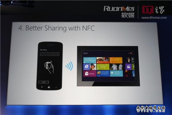 Windows Phone 8 可以通過 NFC 標簽接受聯系人信息,用戶甚至可以制作一張使用 NFC 技術的名片,用 Windows Phone 8 讀取后便可以看到所有信息。類似Android Beam,WP8同樣基于NFC技術支持WP8設備之間的數據傳輸。NFC 技術的一個用武之地:如果兩個 Windows Phone 8 用戶想一起玩多人游戲,可以使用 NFC 直接配對開始。隨后兩臺設備會自動建立 WiFi Direct 連接,不用一直貼在一起。