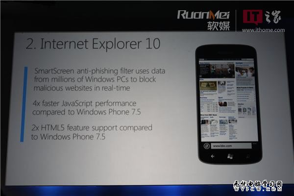 WP8中的瀏覽器從Windows Phone 7.5中IE9升級到IE 10,IE10將內建在Windows Phone 8系統中。WP8內置IE10移動瀏覽器,相比Windows Phone 7.5 JavaScript性能提升四倍,HTML 5性能提升2倍。這是微軟官方提供的SunSpider的對比測試結果,時間越短JavaScript性能越強。我們可以看到,WP8超越了目前市售的GALAXY S III、HTC One S以及iPhone4S。