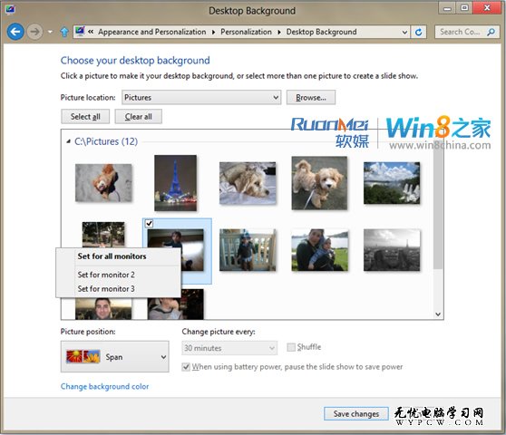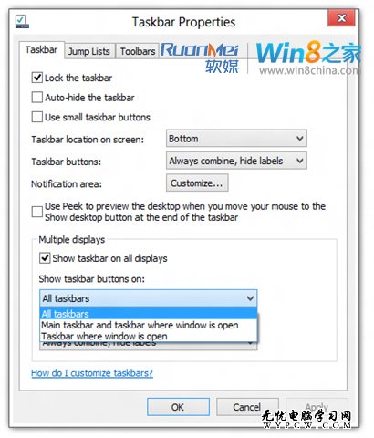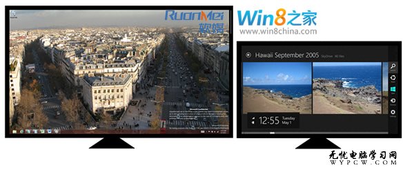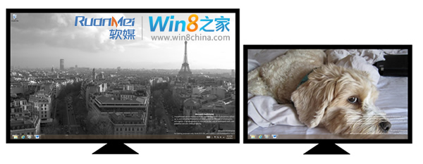 目前有14.68%臺式機和4.36%筆記本用戶都在使用兩個以上顯示器,針對這一情況,當Win8用戶使用多顯示器的時候,會發現微軟在Win8中就壁紙設置、多顯示器的任務欄支持、以及屏幕各角落觸控和Charm菜單調用的增強型體驗。