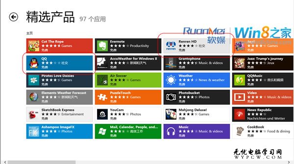 此前QQ for Win8客戶端以及人人網Win8客戶端都是在社交應用分類中的,大家發現Win8QQ等應用的消失,只是因為微軟近期對Windows商店布局進行了改版,取消了“社交”這一應用分類,將諸多應用全部放在“精選產品”中了。