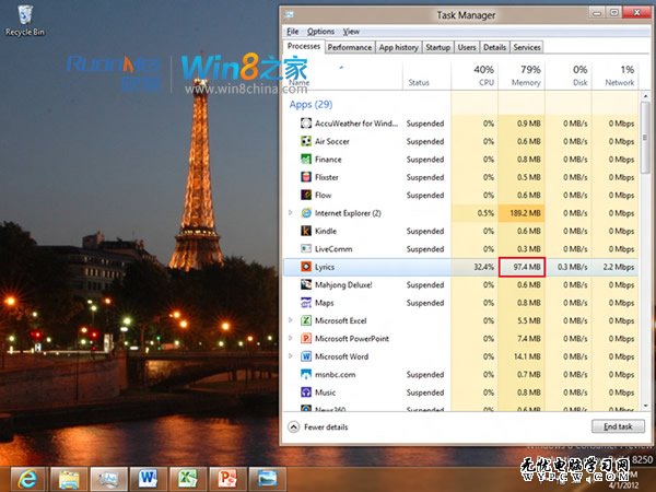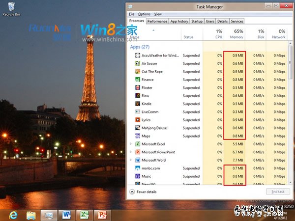 在具備2GB內(nèi)存的PC上開啟多個Metro應(yīng)用,這些程序處于后臺運行因此被Windows暫停。然后開啟更多的Metro樣式應(yīng)用,以便觸發(fā)內(nèi)存回收機制。在這一實驗中,釋放出250MB的物理內(nèi)存給其他應(yīng)用,而無需關(guān)閉現(xiàn)有的處于暫停狀態(tài)的應(yīng)用。