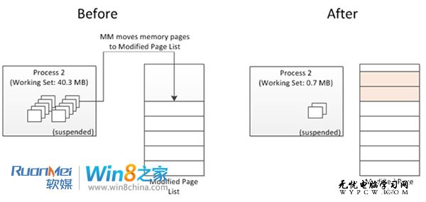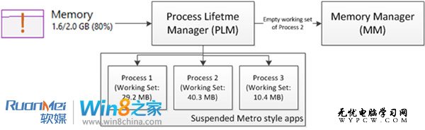 若沒有內(nèi)存容量壓力,這是極有效的狀態(tài),內(nèi)存讓Metro應(yīng)用保持著備戰(zhàn)狀態(tài)。若內(nèi)存容量有所限制,這些暫停的應(yīng)用可將內(nèi)存供給正在運行的程序。