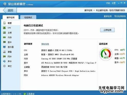 2.然后切換到“硬件檢測”功能,自動幫你檢測當前計算機的硬件設(shè)備詳細信息以及當前硬件設(shè)備當前溫度是多少,當您的顯硬件溫度達到危險值,溫度數(shù)字顏色會變得越來越紅。