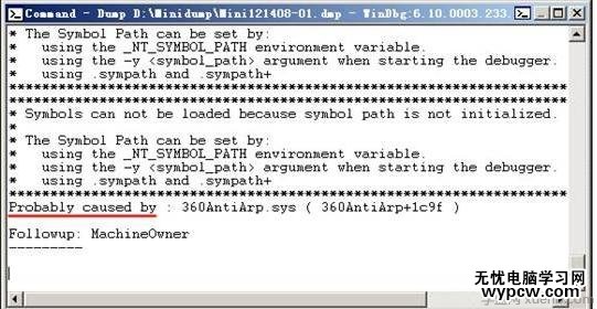 3.打開后程序就開始自動分析文件了,分析完后,找到“Probably caused by”這一行,其后面的文件就是引起電腦藍(lán)屏的文件。