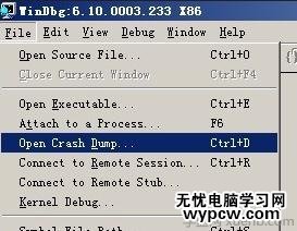 2.通過開始菜單→程序→Debugging tools for windows(x86)-WinDbg”,打開WinDbg程序,點(diǎn)擊程序窗口的File工具欄里的Open Crash Dump,找到位于系統(tǒng)盤的minidump文件夾下的.dmp文件