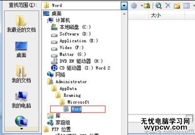 重啟計算機后,我們找到路徑C:Documents and Settings/Administrator/APPData/Microsof/tWord文件夾: