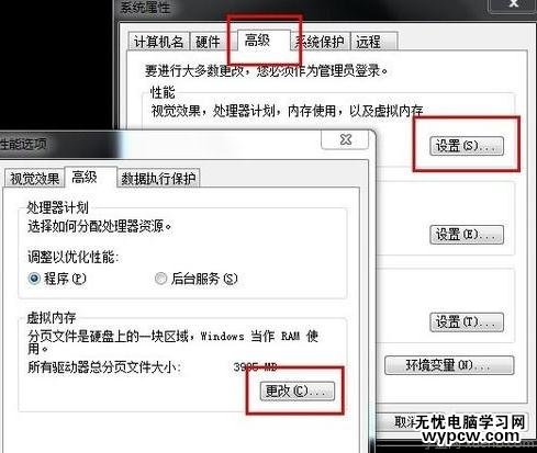 3.如果我們經常需要運行一些大的程序,每次都是因為內存不足引起死機的話,此時我們就需要增大我們的虛擬內存。右擊我的電腦,點擊屬性,找到高級選項卡,點擊性能的設置選項,然后在點擊高級選項,找到虛擬內存,點擊更改