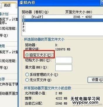 4.默認的虛擬內存都是設置在C盤,但是C盤是一般是我們系統盤,占用它的空間可能會影響我們的運行速度,所以我們設置虛擬內存的時候盡量不要使用C盤,我們可以選擇其他盤符,例如D盤,然后點擊自定義大小,填寫初始大小和最大值即可,虛擬內存初始大小一般設置為內存的1.5倍,最大值則是內存的3倍。