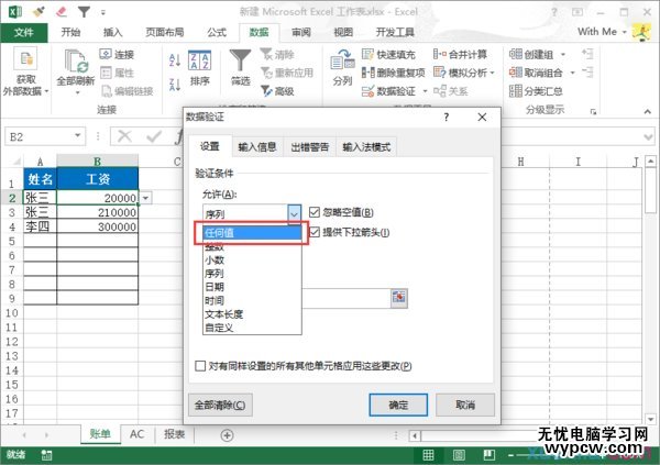 刪除下拉菜單步驟3:點擊“數據”菜單下的“數據驗證/數據有效性”,在設置選項卡下選擇“任何值”
