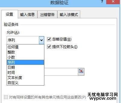 創建下拉菜單步驟2:在彈出的“數據驗證”菜單中,選擇“序列”。