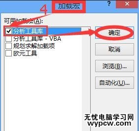 調出數據分析步驟3:再在彈出的【加載宏】窗口下——>【鼠標左鍵】單擊勾選【分析工具庫】——>在右側【鼠標左鍵】單擊【確定】按鈕;
