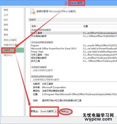 調出數據分析步驟2:然后在彈出的【Excel選項】窗口下——>【鼠標左鍵】單擊【加載項】——>在【管理:】右方選擇【Excel 加載項】選項卡——>【鼠標左鍵】單擊【轉到】按鈕;