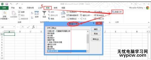調出數據分析步驟4:最后在Excel2013工作文檔中【鼠標左鍵】單擊【數據】選項卡即可看到彈出的【數據分析】窗口及【數據分析】模塊下包含的【分析工具】。