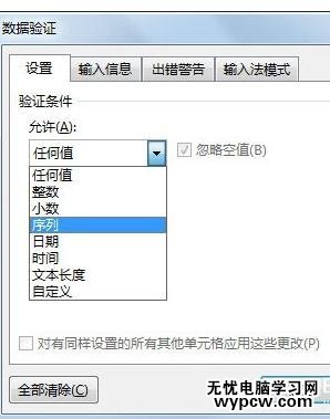 下拉菜單制作步驟3:驗證條件 允許 中選擇 序列