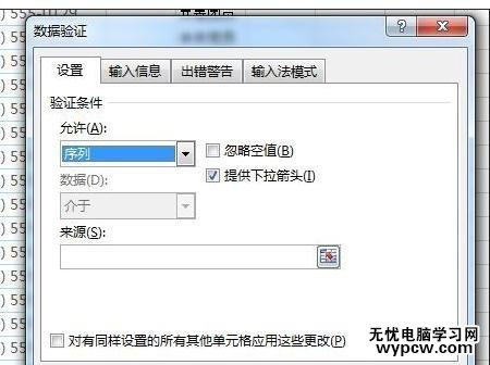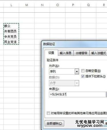設置下拉菜單步驟4:在彈出的窗口中,選擇驗證條件,在下拉菜單中選擇“序列”,在下面的來源中選擇 群眾、共青團員、中共黨員、民主黨派 的位置,然后點擊“確定”