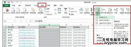 設置下拉菜單步驟3:然后選中“政治面貌”這一列,點擊菜單欄中的“數據”,接著選擇“數據驗證”,在下拉菜單中選擇“數據驗證”。