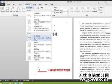 步驟二:首先,將光標置于首頁的尾部。然后依次選擇“頁面布局”-“分隔符”,在下拉菜單中選擇“分節(jié)符”里面的“下一頁”。這樣子,就將文檔分成了兩節(jié),這個時候格式有可能出現偏差,可以通過刪減空格來調整