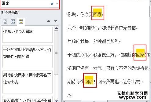 步驟二:此時在文檔的左邊便會彈出一個“導航”的任務窗格,在里面輸入想要查閱的詞語,系統(tǒng)便會自動在任務窗格中搜索出該詞所在的句子列出來,無需用鼠標點擊,而在文檔的正文部分,被搜索出來的詞語都會用黃色的標簽框標注起來。例如,這里我們輸入“回家”;