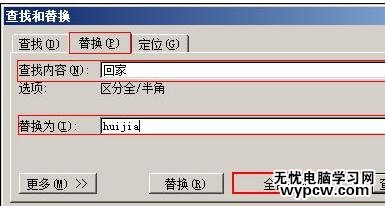 步驟二:此時會彈出一個“查找和替換”的對話框,我們點擊“替換”選項卡,在“查找內(nèi)容”選項輸入要找到的詞語,在“替換為”的選項中輸入需要被替換成的字詞,然后點擊“全部替換”例如。這里我們把“回家”全部替換為“huijia”;