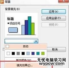 點擊背景后,即可出現(xiàn)設(shè)置背景圖片的這樣一個對話框,點擊下拉箭頭,找到填充效果。
