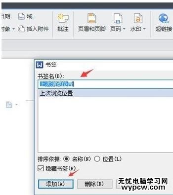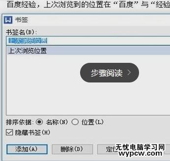 3在彈出的“書簽”窗口中,給定義一個“書簽名”,大家可以自己設定自己喜歡的書簽名,然后點擊“添加”就添書簽加成功了