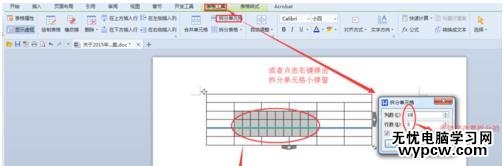 4.如果你要拆分單元格,先選中要拆分的單元格,然后點擊表格工具里的拆分單元格,或者單擊鼠標右鍵,選擇拆分單元格,接著輸入你想要拆分成幾行幾列,點擊確定,拆分單元格即完成。