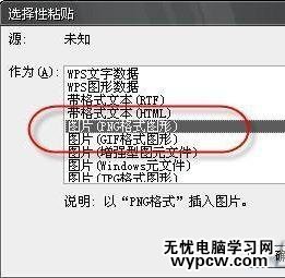 選中素材中的文字框,按下“Ctrl+X”鍵將其剪切到剪貼板中。然后點擊菜單命令“編輯→選擇性粘貼”,打開“選擇性粘貼”對話框,在列表中選擇“圖片(PNG格式圖形)”,如圖所示,確定后將其以圖片的形式粘貼到文檔中。