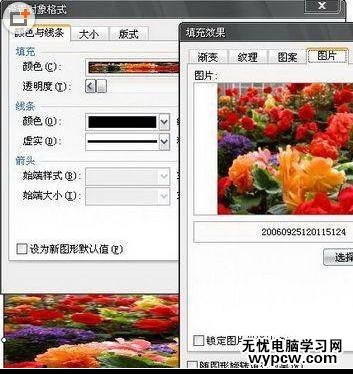 點擊“繪圖”工具欄上的“矩形”按鈕,拖出一個新的矩形。選中此矩形并在此矩形上點擊右鍵,在彈出的菜單中點擊“設置對象格式”命令,在打開的“設置對象格式”對話框中點擊“顏色與線條”選項卡,然后在“填充”項目下“顏色”下拉列表中點擊“填充效果”命令,打開“填充效果”對話框。然后點擊對話框的“圖片”選項卡,點擊選項卡中“選擇圖片”按鈕,如圖4所示,找到事先準備好的圖片文件雙擊,一路確定后就可以將圖片填充到矩形中了。