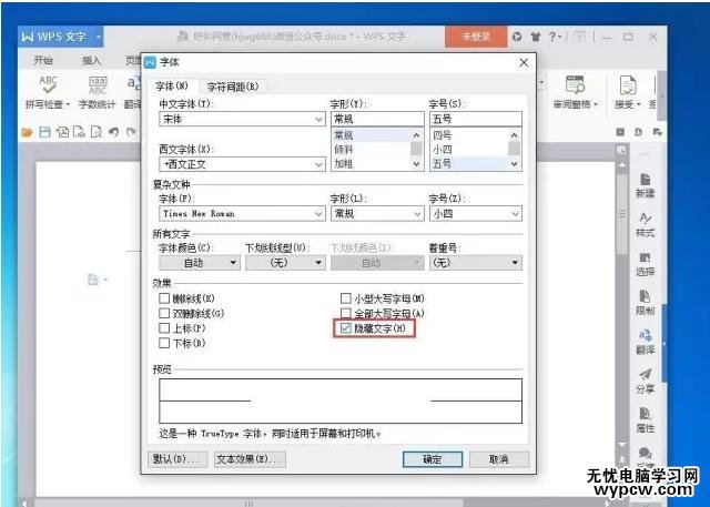 3.在“字體”窗口中選擇→“隱藏文字”。