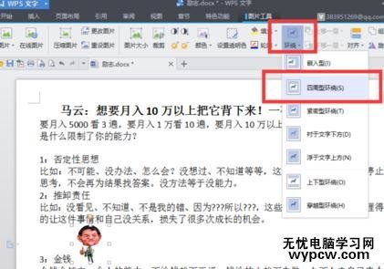 步驟6:在顯示的”圖片工具“欄選項中,依次點擊”環繞“-->”四周環繞“。如圖所示;